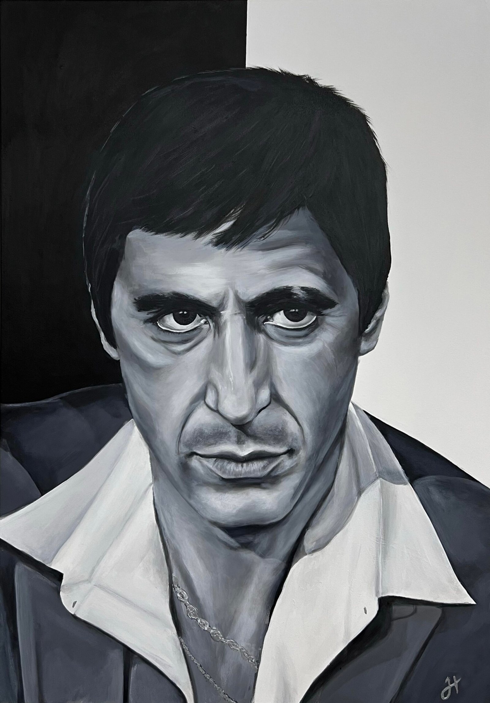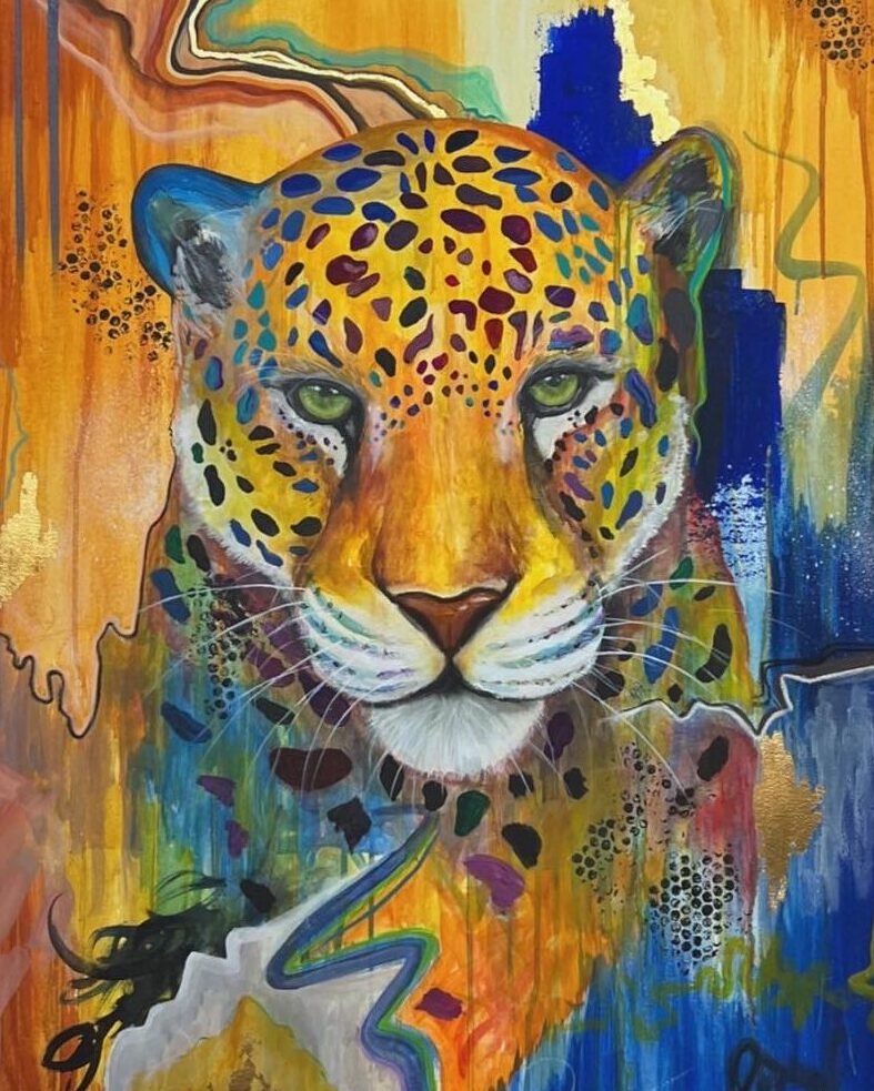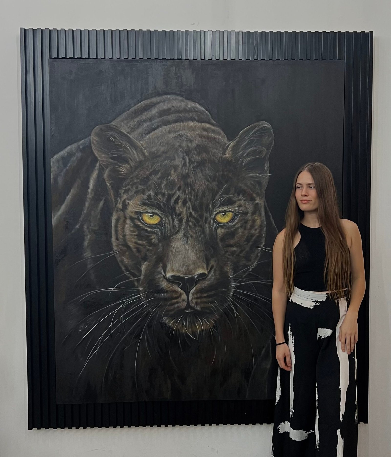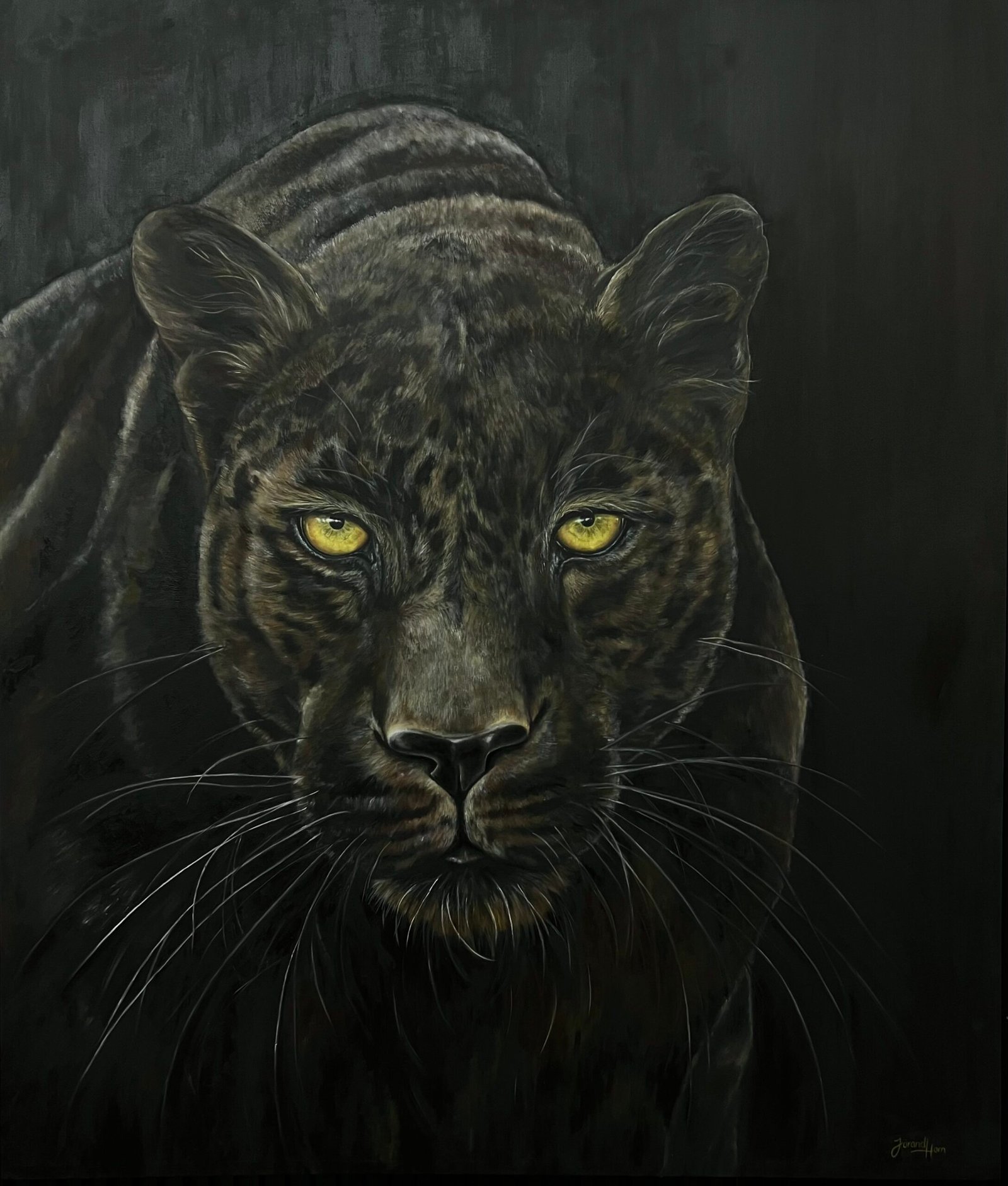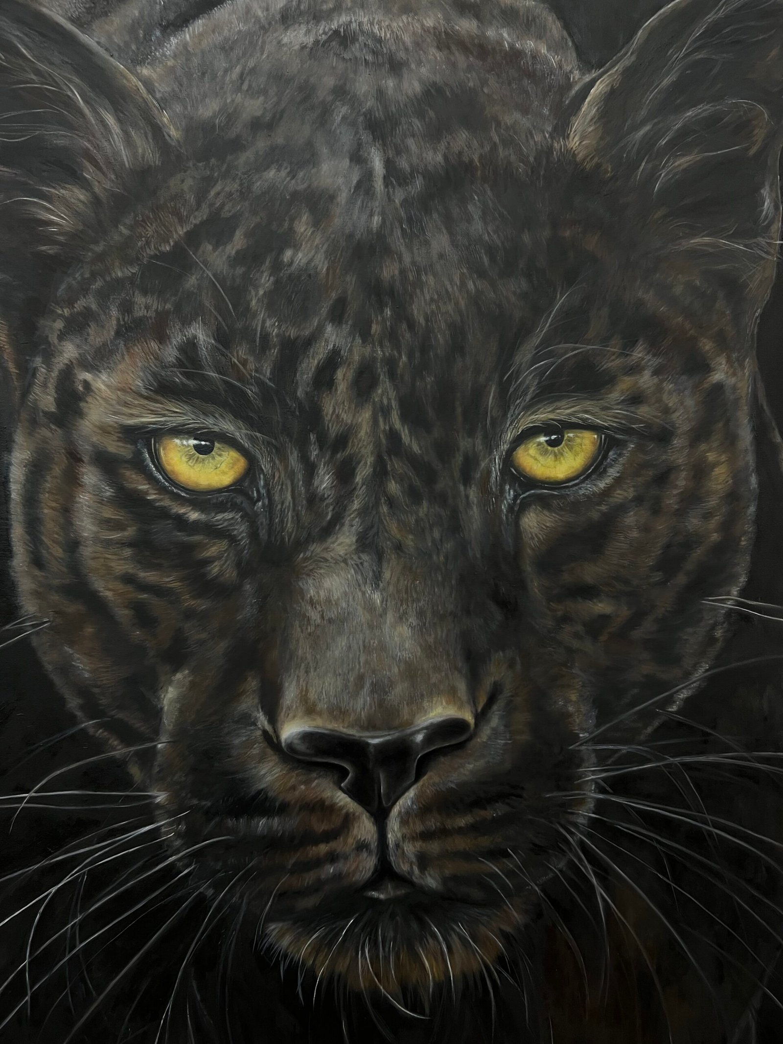 Emerging from darkness with piercing yellow eyes, this black panther embodies mystery and silent strength. Executed on a colossal 1.80-meter canvas, the sheer scale transforms the portrait into an apparition, demanding immediate awe and absolute respect.